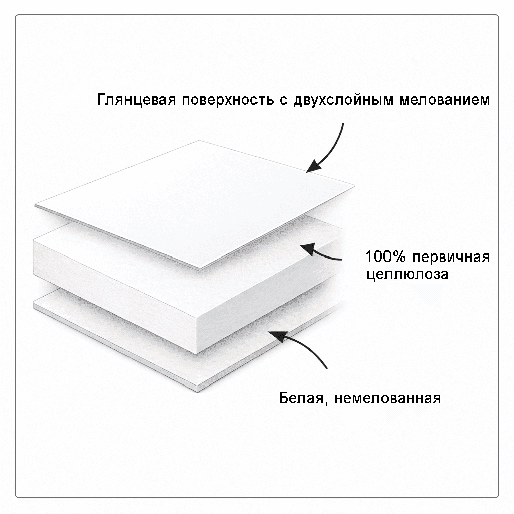 - Лицевая сторона — глянцевая поверхность с двухслойным мелованием
