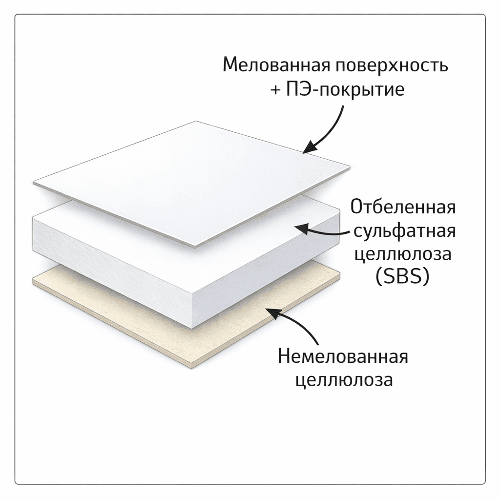 - Основа — отбеленная сульфатная целлюлоза (SBS)