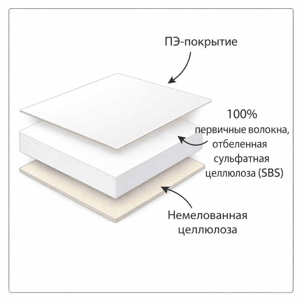 - Основа — 100% первичные волокна, отбеленная сульфатная целлюлоза (SBS)