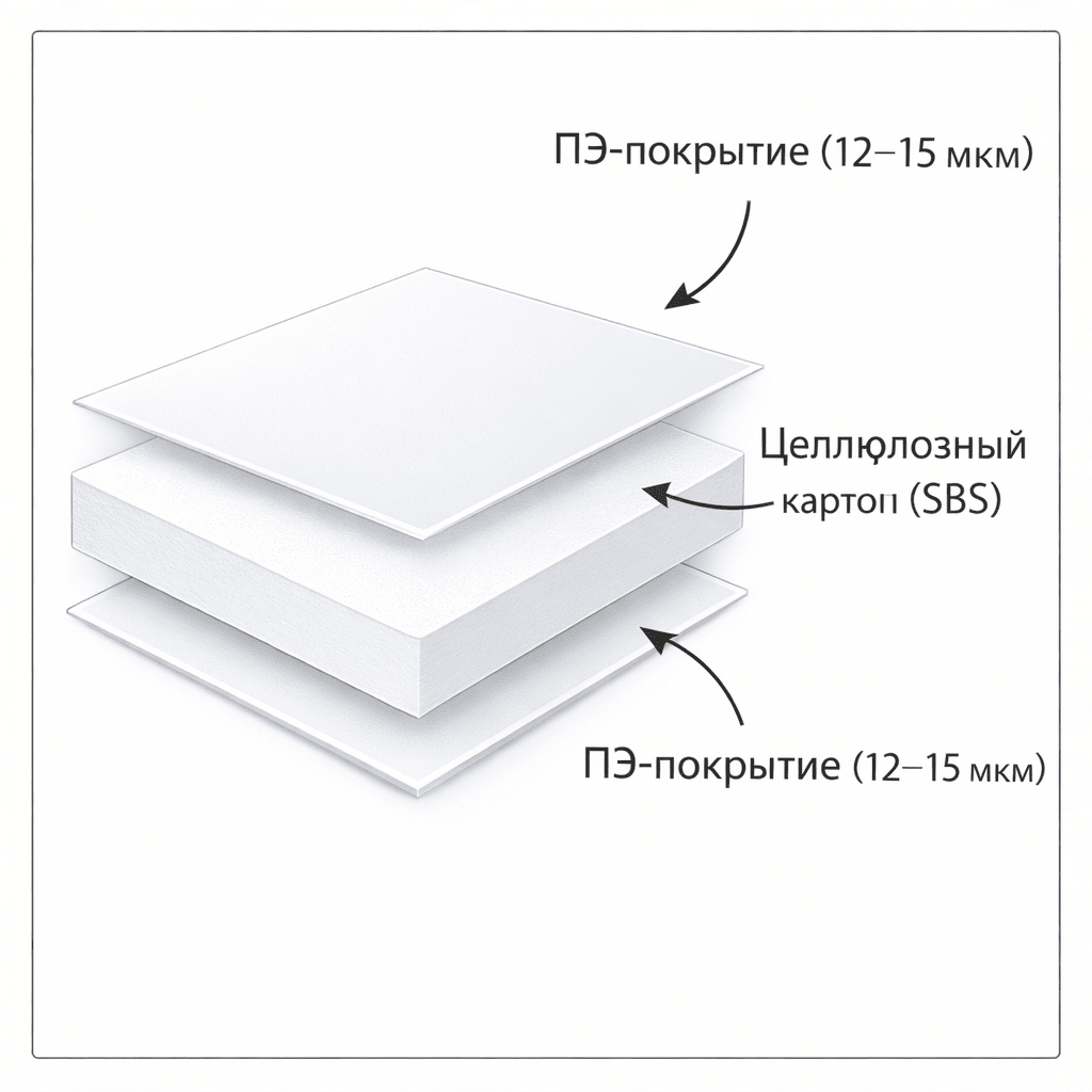 - Основа — целлюлозный картон (SBS, первичные волокна)