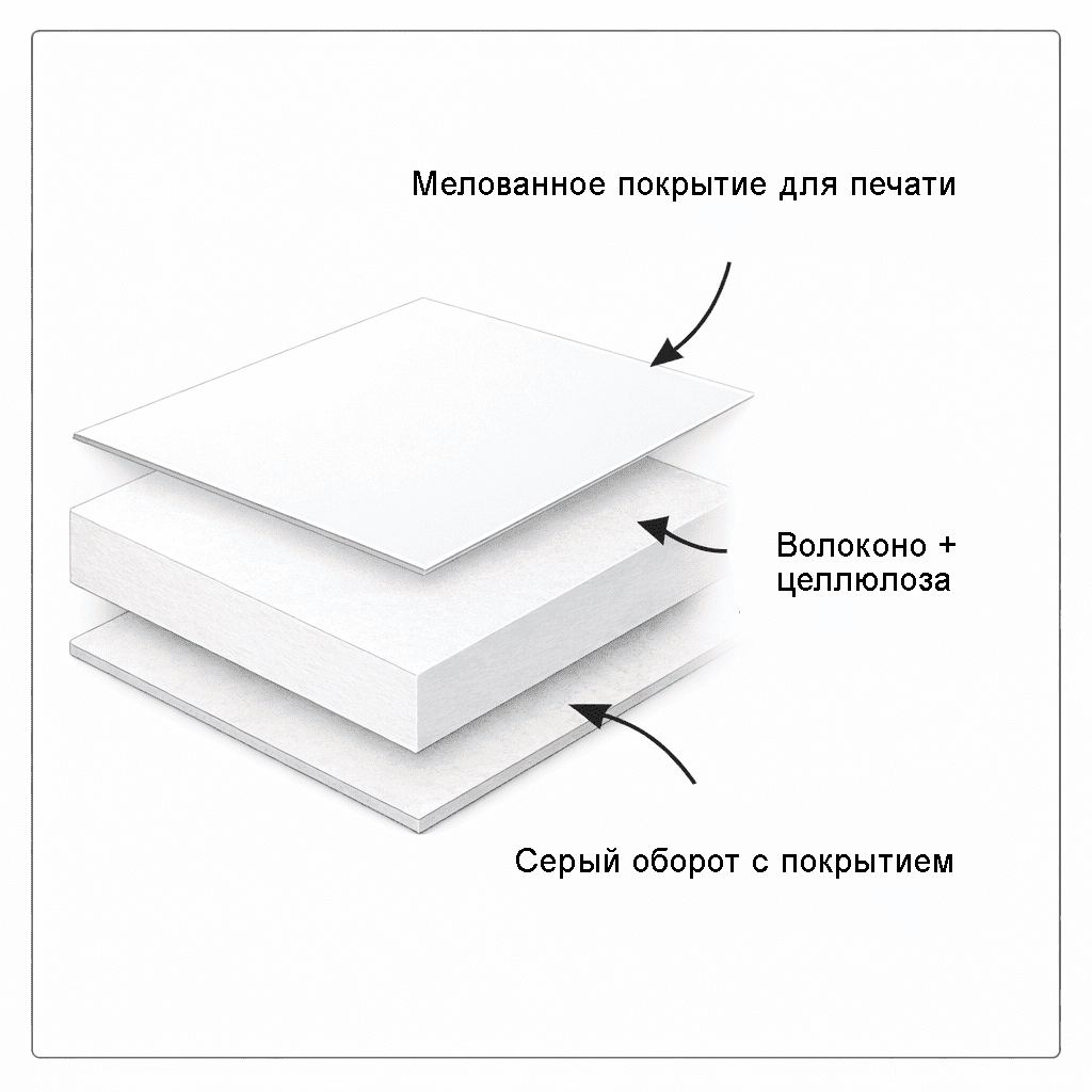 - Верхний слой — мелованное покрытие (3-кратное) для печати