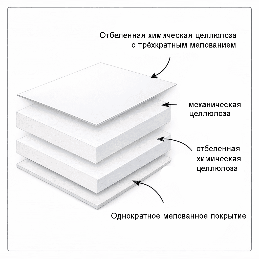 - отбеленная химическая целлюлоза с трёхкратным мелованным покрытием