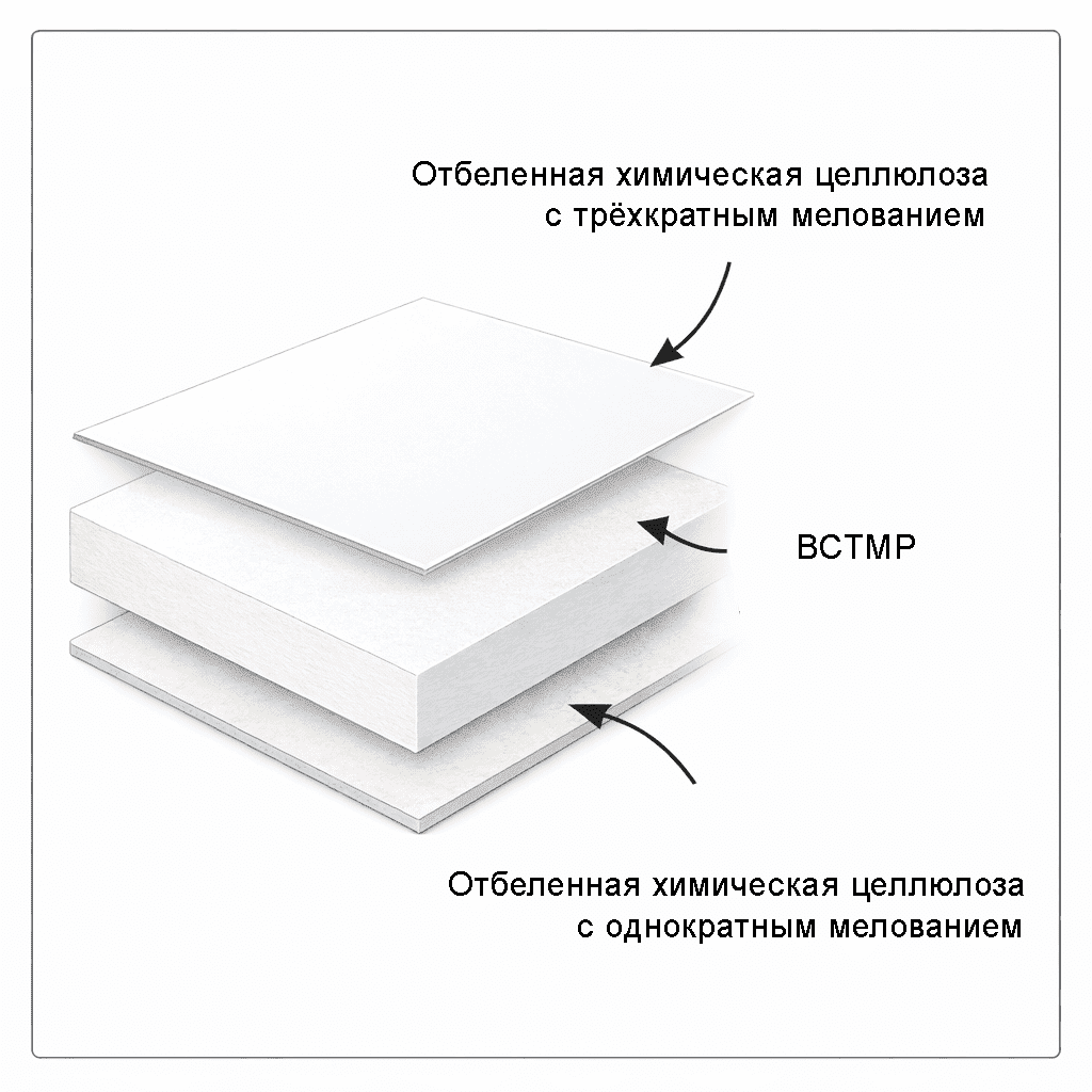 - Нижний слой — отбеленная химическая целлюлоза с однократным мелованием